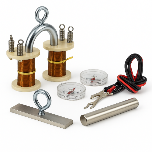 İçerisinde hazır kurulu U elektromıknatıs, 2 adet pusula, metal taşıyıcı halka, üç adet bağlantı kablosu ve demir silindir mevcutdur. Sistemi denemek için 6V pille veya DC güç kaynagına ihtiyaç vardır.