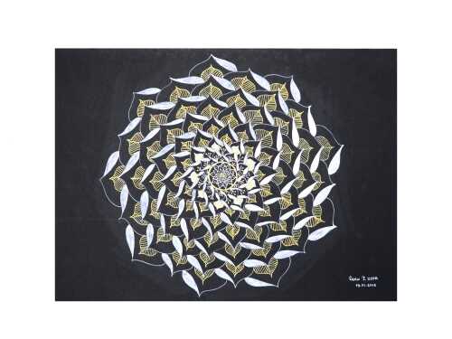 Siyah zemin, dikkati merkezde toplamaya yardımcı olurken; beyaz ve altın tonlu desenler görsel kontrast yaratarak odaklanma ve ritim algısını güçlendirir. Tekrarlayan desenler, gözün spiral boyunca doğal bir akışla hareket etmesini sağlar ve sakinleştirici bir görsel deneyim sunar.